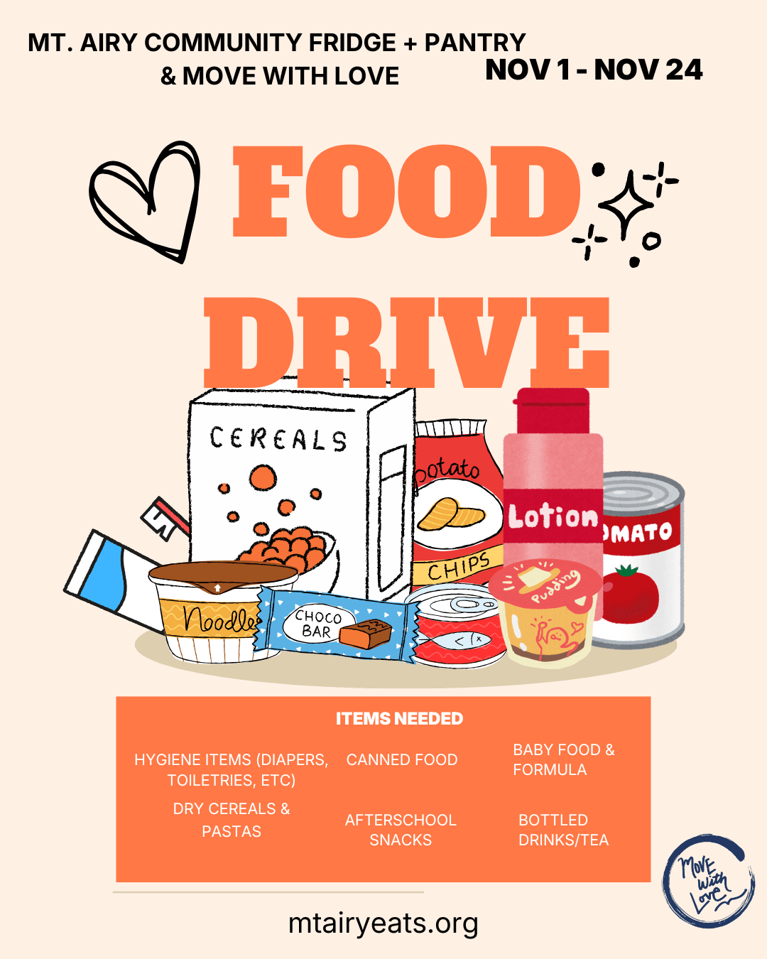 Now through November 24, Move With Love is collecting donations for the Mt. Airy Community Fridge + Pantry.